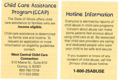 West Central Child Care Connection – Serving the counties of Adams, Brown, Calhoun, Cass, Greene, Hancock, Jersey, Pike, and Schuyler.